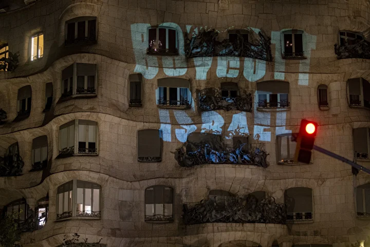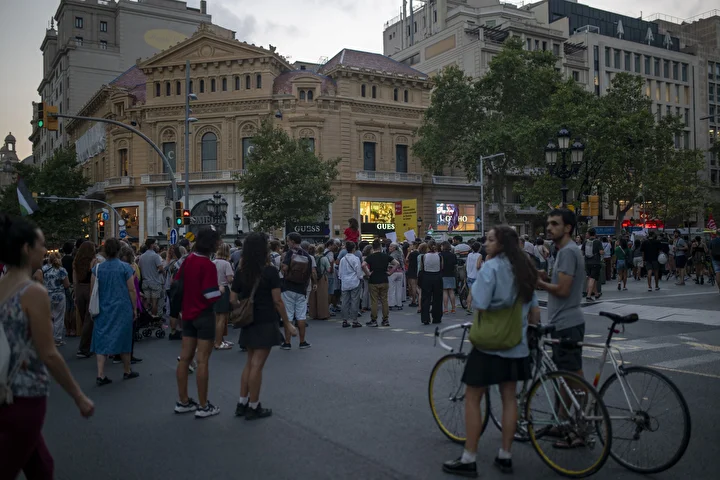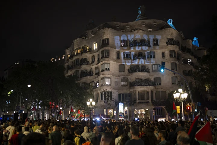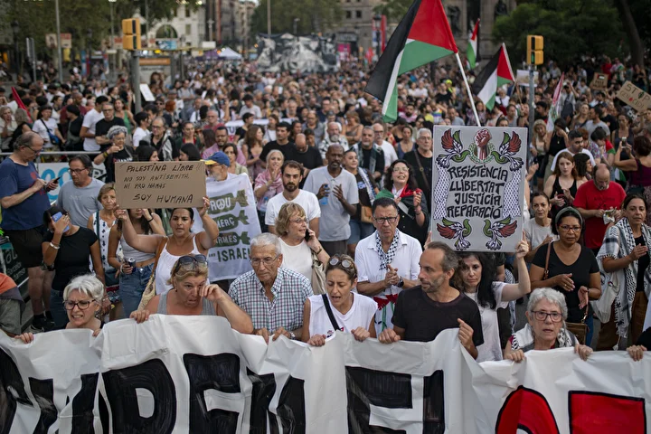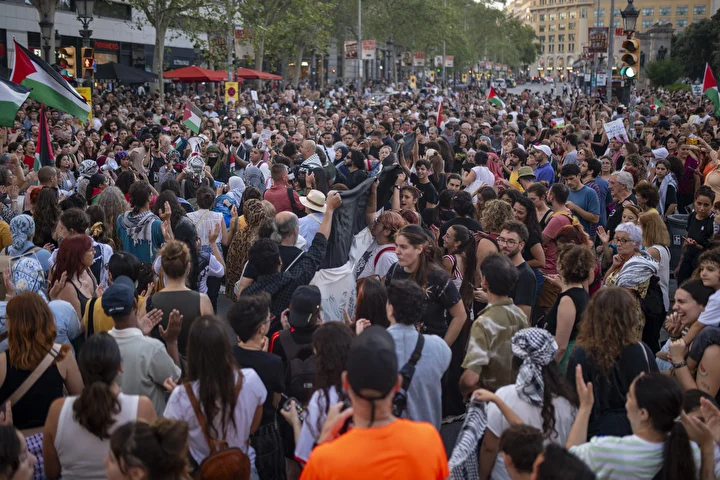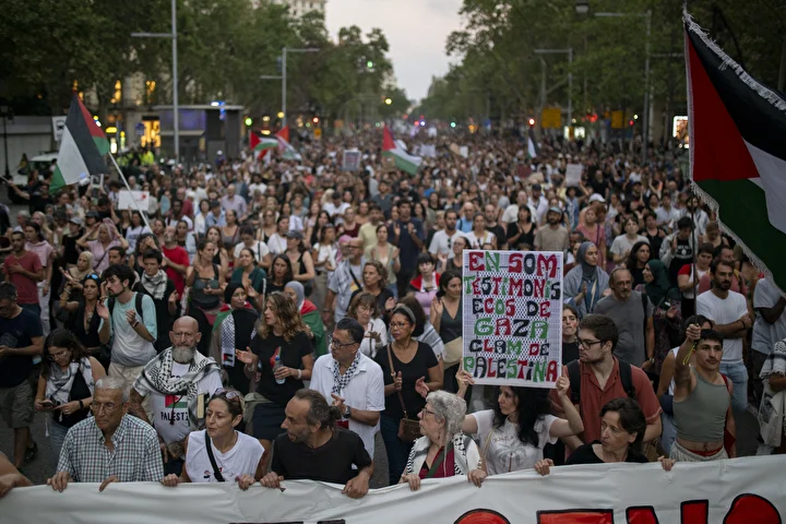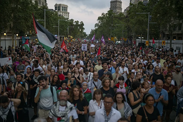 Gösterilerin en büyüğünün gerçekleştiği Barselona’da kent merkezindeki Katalonya Meydanı’nda toplanan kalabalık ellerinde Filistin bayrakları ile Avrupa Birliği’nin (AB) binasına kadar yürüdü.